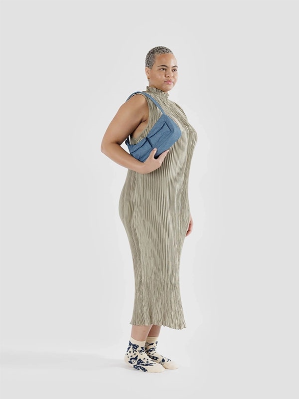 Recycled heavyweight nylon, recycled ripstop nylon lining, plastic buckle, plastic zipper.