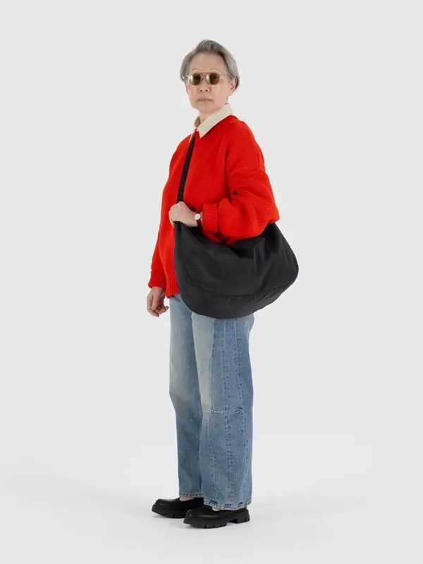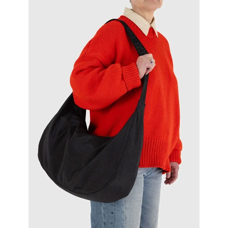 A larger crescent shaped purse that’s roomy enough to fit a laptop, plus all of your essentials. Complete with an internal black logo key leash, metal carabiner and interior zip pocket that makes it easy to stay organized.