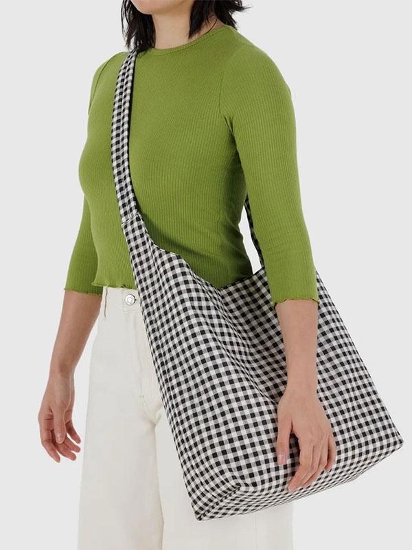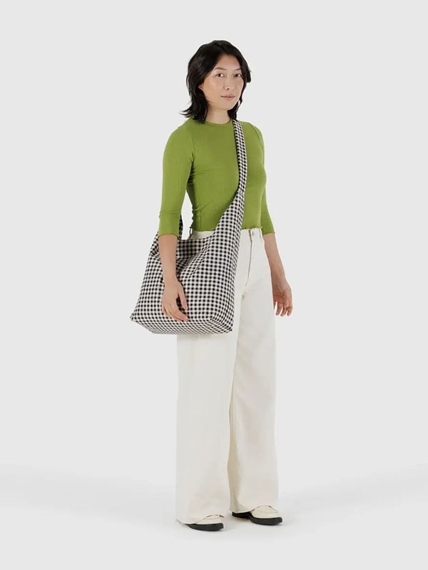 A slouchy, softly structured nylon bag with an adjustable strap. Interior zip pocket with a magnetic closure. Fits a 13/14” Puffy Laptop Sleeve.