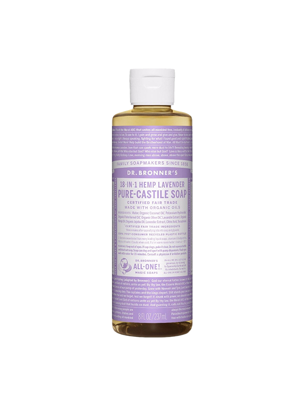 Scented with pure lavender and lavandin oils to calm the mind and soothe the body! Dr. Bronner's Pure-Castile Lavender Liquid Soap is concentrated, biodegradable, versatile and effective. Made with organic and certified fair trade ingredients, packaged in a 100% post-consumer recycled bottle. Dr. Bronner's liquid soaps are three times more concentrated than most liquid soaps on the market, which means more soap per bottle and less waste in packaging materials.