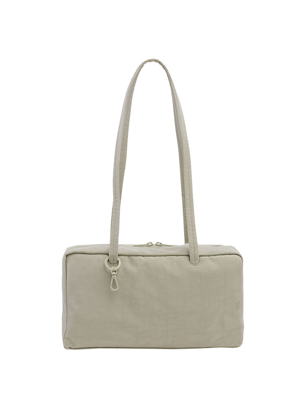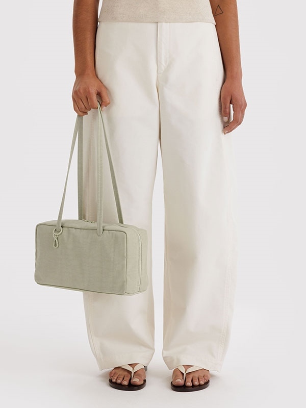Recycled heavyweight nylon, recycled ripstop nylon lining, plastic buckle, plastic zipper.