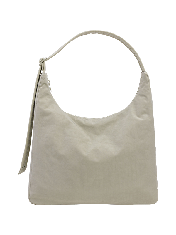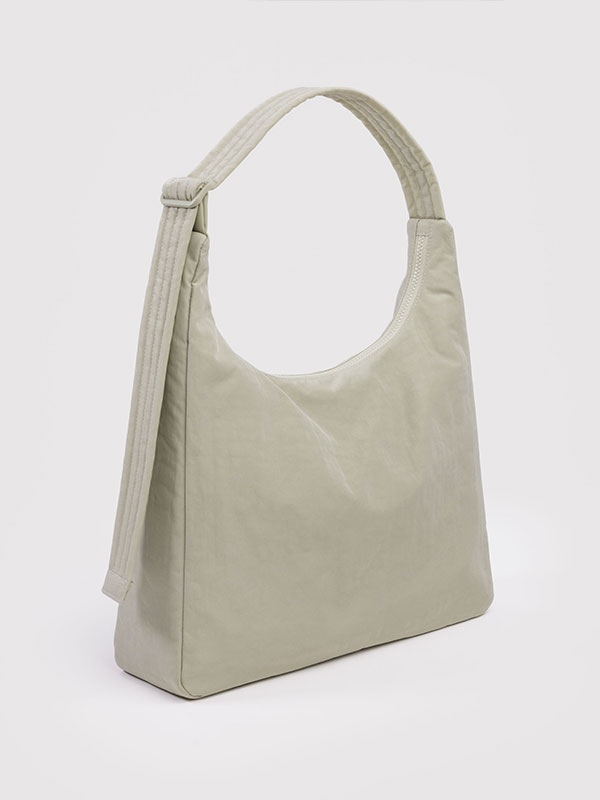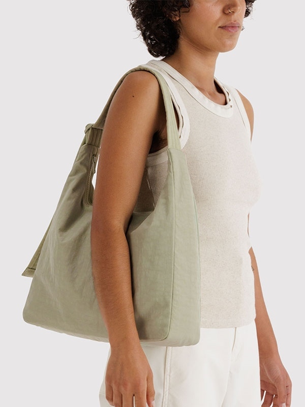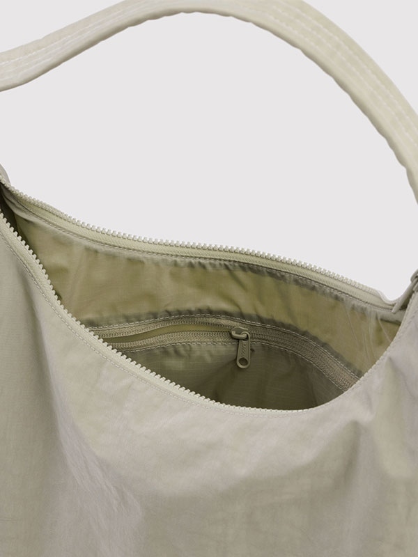 Recycled heavyweight nylon, recycled ripstop nylon lining, plastic buckle, plastic zipper.