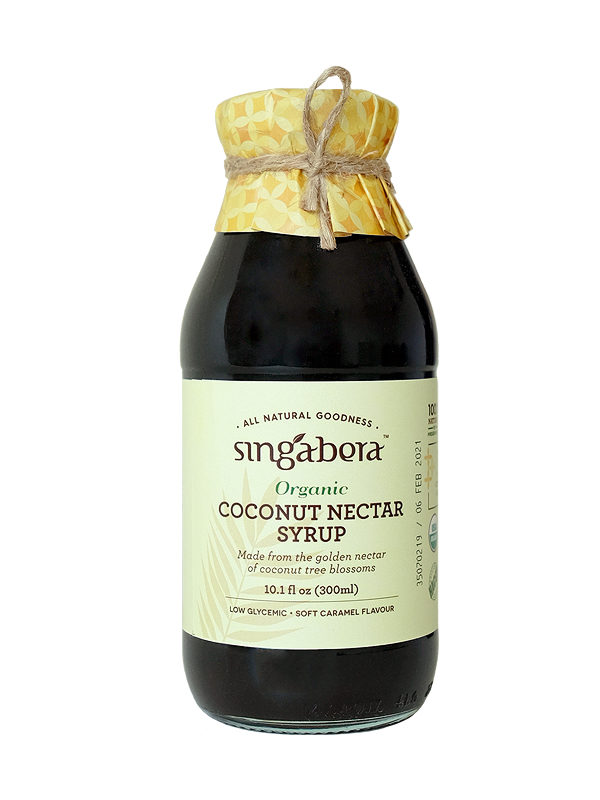 Singabera all-natural Organic Coconut Nectar Syrup is made from hand-tapped golden nectar of coconut palm blossoms, then slow kettle-boiled to distill its essential goodness. With its delicious caramel flavor and low glycemic index, Singabera’s minimally processed golden coconut sugar is an ideal substitute for white cane sugar in coffee, tea, baking and cooking.