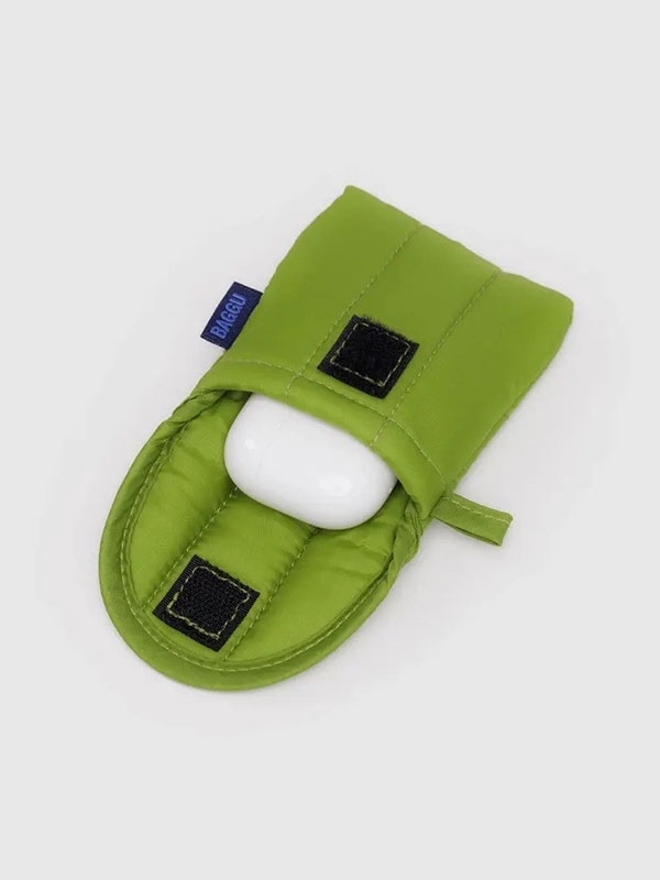 A quilted home for your earbuds. Baggu Puffy Earbuds Case is lightly padded to protect them from getting scratched or dirty. Features a velcro flap closure.