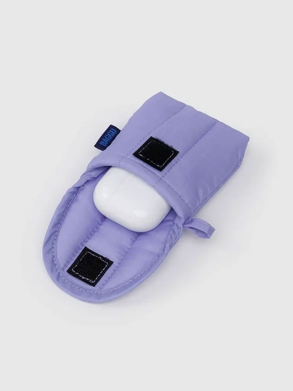 A quilted home for your earbuds. Baggu Puffy Earbuds Case is lightly padded to protect them from getting scratched or dirty. Features a velcro flap closure.
